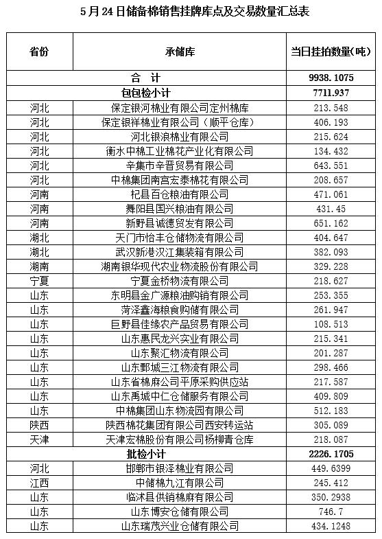 中國儲備棉管理有限公司定于5月24日上市銷售儲備棉重量9938.1075噸,共60捆。具體庫點及數(shù)量見下表。