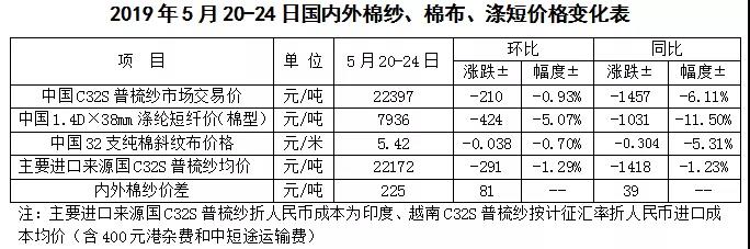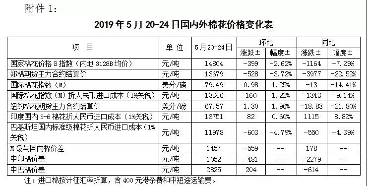 本周,受中美貿(mào)易緊張形勢(shì)以及下游市場(chǎng)疲弱影響,國(guó)內(nèi)棉價(jià)繼續(xù)下跌。2019年5月20-24日,代表內(nèi)地標(biāo)準(zhǔn)級(jí)皮棉銷售均價(jià)的國(guó)家棉花價(jià)格B指數(shù)14804元/噸,較上周下跌399元/噸,跌幅2.62%;鄭州棉花期貨主力合約結(jié)算均價(jià)13679元/噸,較上周下跌528元/噸,跌幅3.72%;儲(chǔ)備棉輪出成交均價(jià)13148元/噸,較上周下跌385元/噸,跌幅2.85%。
