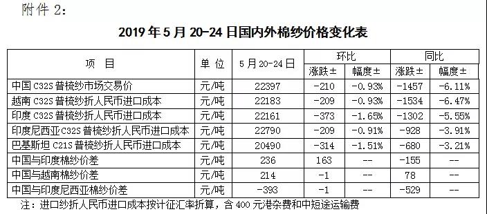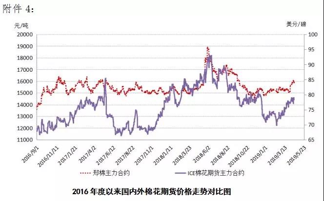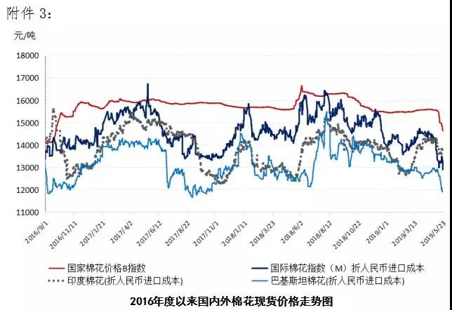 本周,受美棉播種延遲和簽約量顯著增加提振,國(guó)際棉價(jià)有所上漲。2019年5月13-17日,紐約棉花期貨主力合約結(jié)算價(jià)67.57美分/磅,較上周上漲1.3美分/磅,漲幅1.96%,代表進(jìn)口棉中國(guó)主港到岸均價(jià)的國(guó)際棉花指數(shù)(M)79.49美分/磅,較上周上漲0.98美分/磅,漲幅1.25%,折人民幣進(jìn)口成本13346元/噸,較上周上漲160元/噸,漲幅1.22%;內(nèi)外棉價(jià)差1457元/噸,較上周縮小559元/噸。(詳見(jiàn)附件1)