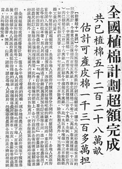 1950年6月12日,人民日報(bào)一版刊發(fā)消息,當(dāng)年全國已植棉5228萬畝,預(yù)計(jì)可產(chǎn)皮棉1300多萬擔(dān)。