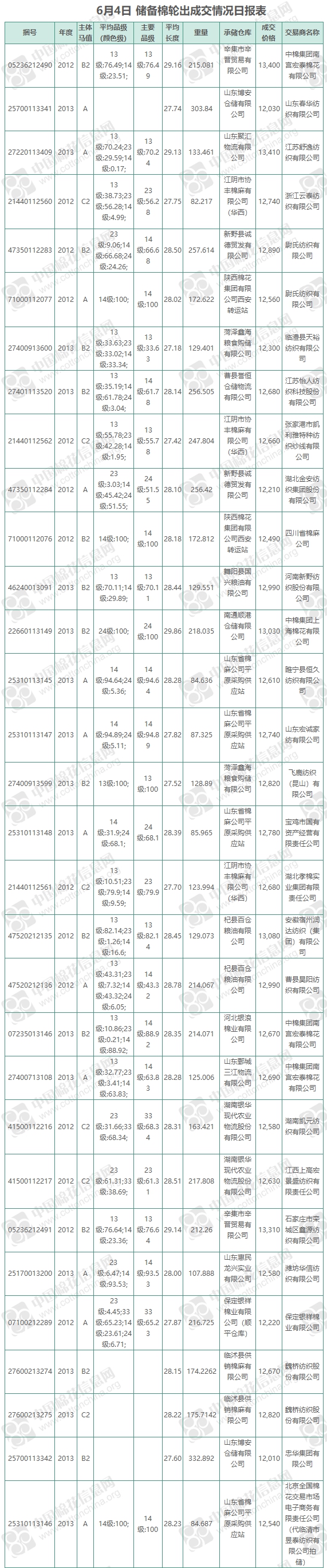 6月4日儲備棉輪出銷售資源9842.4009噸,實際成交5454.0114噸,成交率55.41%,成交均價12667元/噸,較3日上漲16元/噸;折3128價格14049元/噸,較3日上漲71元/噸。