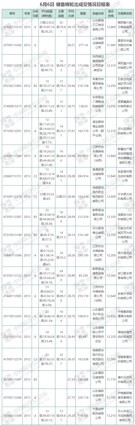 6月6日儲(chǔ)備棉輪出銷售資源9855.1348噸,實(shí)際成交3813.267噸,成交率38.69%,成交均價(jià)12524元/噸,較5日上漲21元/噸;折3128價(jià)格13967元/噸,較5日下跌48元/噸。