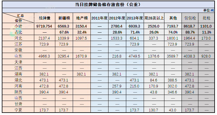 2.當(dāng)日輪出上市儲(chǔ)備棉中有部分為分批抽樣公檢。抽樣比率及抽樣方法按照棉花國(guó)家標(biāo)準(zhǔn)規(guī)定,品質(zhì)指標(biāo)包括顏色級(jí)、軋工質(zhì)量、長(zhǎng)度、馬克隆值、斷裂比強(qiáng)度、長(zhǎng)度整齊度指標(biāo);重量采用原入庫(kù)公檢結(jié)果,不再重新檢驗(yàn)。