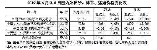 本周,國內棉紗成交稀少,庫存繼續(xù)攀升,純棉紗價格繼續(xù)下跌;國際棉紗需求清淡,外紗價格繼續(xù)下行,由于6月計征匯率調整,外紗折人民幣進口成本上升,常規(guī)純棉外紗均價高于國產紗價格635元/噸;國內棉布依舊疲弱,純棉布價格繼續(xù)下行;滌綸短纖價格隨原料PTA繼續(xù)下滑。