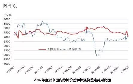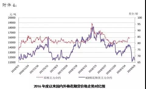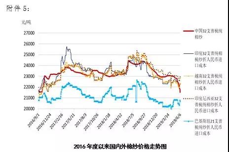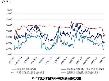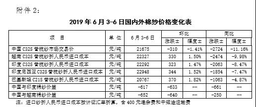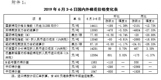 本周,受經濟數據不及預期和石油、谷類跌勢影響,國際棉價下跌。2019年6月3-6日,紐約棉花期貨主力合約結算價67.16美分/磅,較上周下跌0.8美分/磅,跌幅1.17%,代表進口棉中國主港到岸均價的國際棉花指數(M)為77.65美分/磅,較上周下跌0.58美分/磅,跌幅0.74%,折人民幣進口成本13048元/噸,較上周下跌80元/噸,跌幅0.61%;內外棉價差1363元/噸,較上周縮小118元/噸。(詳見附件1)