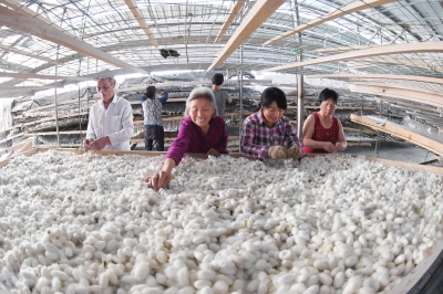 近日,四川南充市蓬安縣金甲鄉(xiāng)焰山村龍祥蠶桑種養(yǎng)農(nóng)民專業(yè)合作社的蠶房里,春繭大獲豐收讓蠶農(nóng)們喜笑顏開。該合作社預(yù)計(jì)今年春繭產(chǎn)量達(dá)3000公斤。近年來(lái),蓬安縣采取“支部+合作社+公司+農(nóng)戶+電商”的運(yùn)作模式,不斷深化蠶桑產(chǎn)業(yè)鏈發(fā)展,做強(qiáng)“蠶桑+”產(chǎn)業(yè),實(shí)現(xiàn)一二三產(chǎn)業(yè)融合發(fā)展,預(yù)計(jì)今年全縣蠶繭產(chǎn)量達(dá)70萬(wàn)公斤。