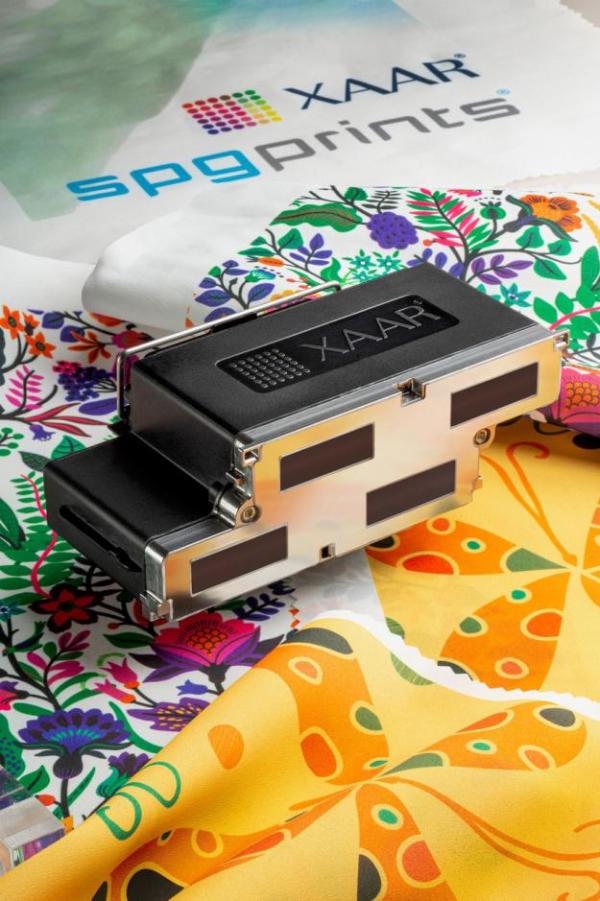 圖片顯示Xaar5601噴印頭及使用Xaar5601和SPG專(zhuān)為該噴印頭發(fā)明的水溶性升華油墨印刷的樣品,樣品以100m/分鐘的速度進(jìn)行單程和雙色模式印刷。