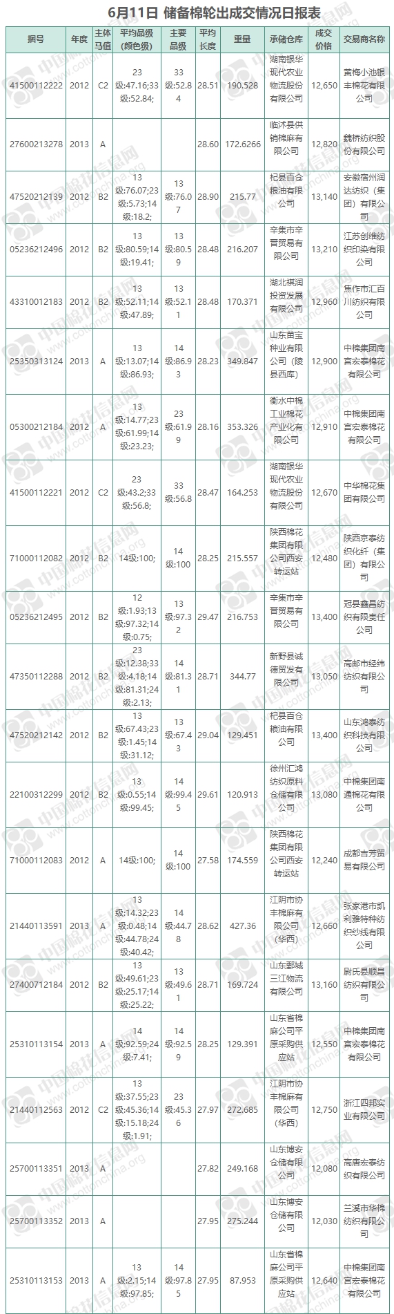 6月11日儲備棉輪出銷售資源9847.7018噸,實際成交4646.4566噸,成交率47.18%,成交均價12784元/噸,較10日上漲212元/噸;折3128價格14008元/噸,較10日上漲5元/噸。