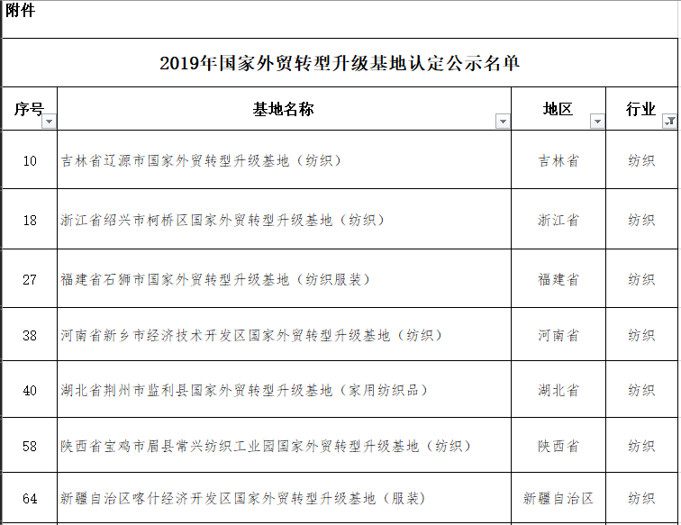 為推進(jìn)貿(mào)易強(qiáng)國(guó)建設(shè),推動(dòng)外貿(mào)穩(wěn)中提質(zhì),我們擬認(rèn)定北京市經(jīng)濟(jì)技術(shù)開發(fā)區(qū)(新型顯示產(chǎn)業(yè))基地等65家基地為國(guó)家外貿(mào)轉(zhuǎn)型升級(jí)基地,現(xiàn)予以公示。本次公示期限為2019年6月12-18日。如有異議,請(qǐng)于6月18日17時(shí)前將書面意見送達(dá)商務(wù)部外貿(mào)司。