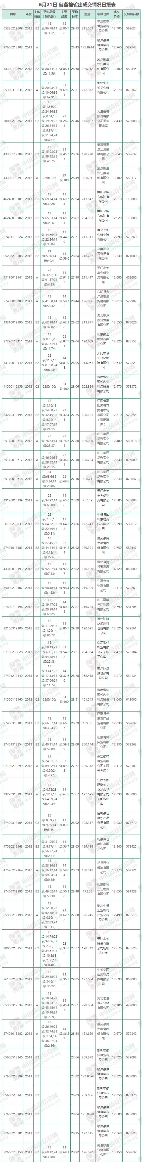 6月21日儲備棉輪出銷售資源9943.2449噸,實際成交9332.9368噸,成交率93.86%,成交均價12911元/噸,較20日下跌36元/噸;折3128價格14050元/噸,較20日下跌124元/噸。