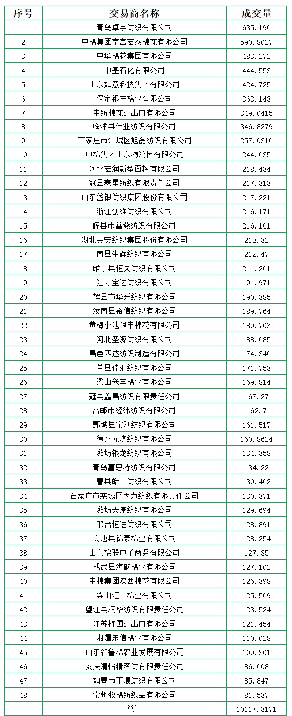 6月24日儲(chǔ)備棉輪出銷(xiāo)售資源10117.3171噸,實(shí)際成交10117.3171噸,成交率100.00%,成交均價(jià)12943元/噸,較21日上漲32元/噸;折3128價(jià)格14078元/噸,較21日上漲28元/噸。