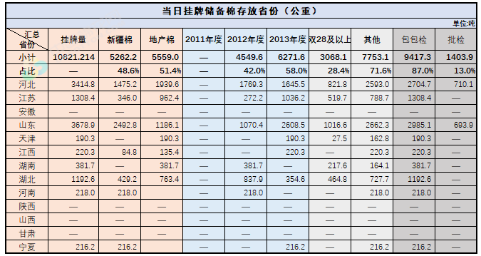 2.當(dāng)日輪出上市儲(chǔ)備棉中有部分為分批抽樣公檢。抽樣比率及抽樣方法按照棉花國(guó)家標(biāo)準(zhǔn)規(guī)定,品質(zhì)指標(biāo)包括顏色級(jí)、軋工質(zhì)量、長(zhǎng)度、馬克隆值、斷裂比強(qiáng)度、長(zhǎng)度整齊度指標(biāo);重量采用原入庫(kù)公檢結(jié)果,不再重新檢驗(yàn)。