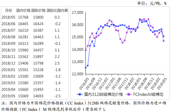 (一)國內(nèi)棉價大幅下跌。5月中美經(jīng)貿(mào)摩擦升溫。美國從5月10日起對來自我國的部分商品提高關稅,我國也采取相應反制措施,市場主體擔憂征稅范圍擴大,信心嚴重受挫,國內(nèi)棉價快速大幅下滑。5月國內(nèi)3128B級棉花月均價每噸15069元,環(huán)比跌3.8%,同比跌4.4%。鄭棉期貨主力合約(CF909)月結(jié)算價每噸13510元,環(huán)比跌14.2%,同比跌28.2%。
