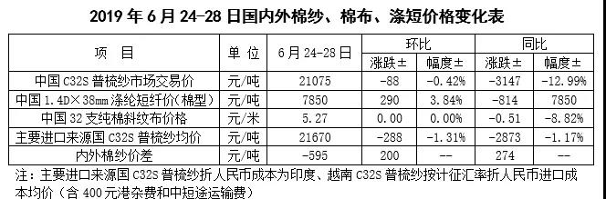 本周,受市場(chǎng)等待G20峰會(huì)中美兩國(guó)元首會(huì)晤,以及美國(guó)棉花實(shí)播面積低于意向面積影響,國(guó)際棉價(jià)偏強(qiáng)振蕩為主。2019年6月24-27日,紐約棉花期貨主力合約結(jié)算價(jià)66.08美分/磅,較上周上漲0.52美分/磅,漲幅0.79%,代表進(jìn)口棉中國(guó)主港到岸均價(jià)的國(guó)際棉花指數(shù)(M)77.29美分/磅,較上周上漲0.14美分/磅,漲幅0.18%,折人民幣進(jìn)口成本13278元/噸,較上周上漲24元/噸,漲幅0.18%;內(nèi)外棉價(jià)差946元/噸,較上周持平。(詳見附件1)