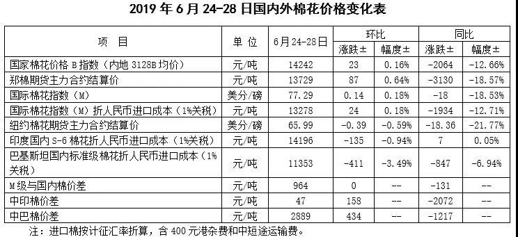 本周,受G20峰會(huì)上中美兩國(guó)元首會(huì)晤利好消息提振,國(guó)內(nèi)棉價(jià)繼續(xù)上漲。2019年6月24-27日,代表內(nèi)地標(biāo)準(zhǔn)級(jí)皮棉銷售均價(jià)的國(guó)家棉花價(jià)格B指數(shù)14242元/噸,較上周上漲23元/噸,漲幅0.16%;鄭州棉花期貨主力合約結(jié)算均價(jià)13729元/噸,較上周上漲87元/噸,漲幅0.64%;儲(chǔ)備棉輪出成交均價(jià)12972元/噸,較上周上漲130元/噸,漲幅1.01%。