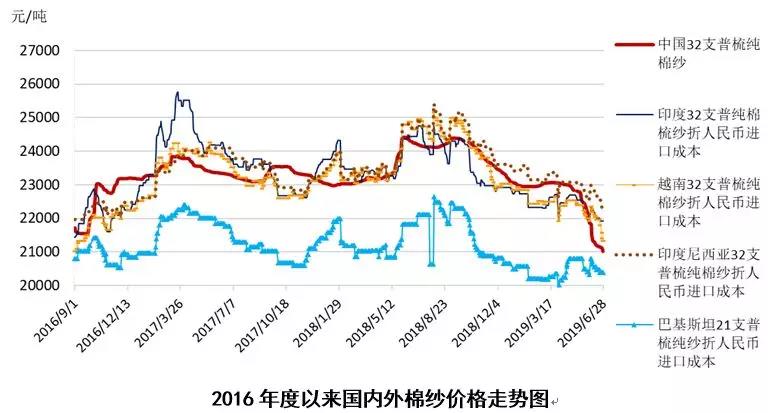 三、國(guó)內(nèi)外棉紗價(jià)格延續(xù)下跌態(tài)勢(shì)