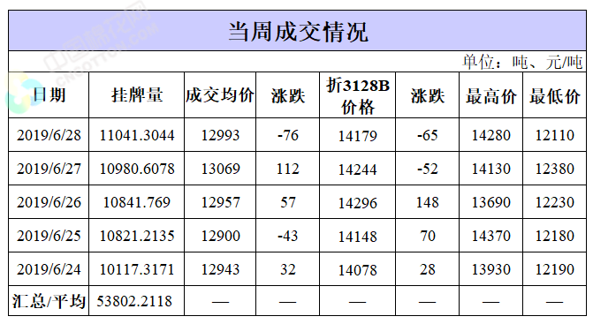 當周,儲備棉輪出成交均價12974元/噸,較前周上漲126元/噸,折標準級(3128B)價格14190元/噸,較前周上漲131元/噸。其中新疆棉成交均價13182元/噸,較前周上漲172元/噸,折3128B價格14370元/噸,較前周上漲200元/噸,平均加價855元/噸,較前周上漲255元/噸;地產(chǎn)棉成交均價12706元/噸,較前周上漲44元/噸,折3128B價格13959元/噸,較前周上漲28元/噸,平均加價444元/噸,較前周下跌16元/噸。當周,儲備棉最高成交價14280元/噸,最低成交價12110元/噸。