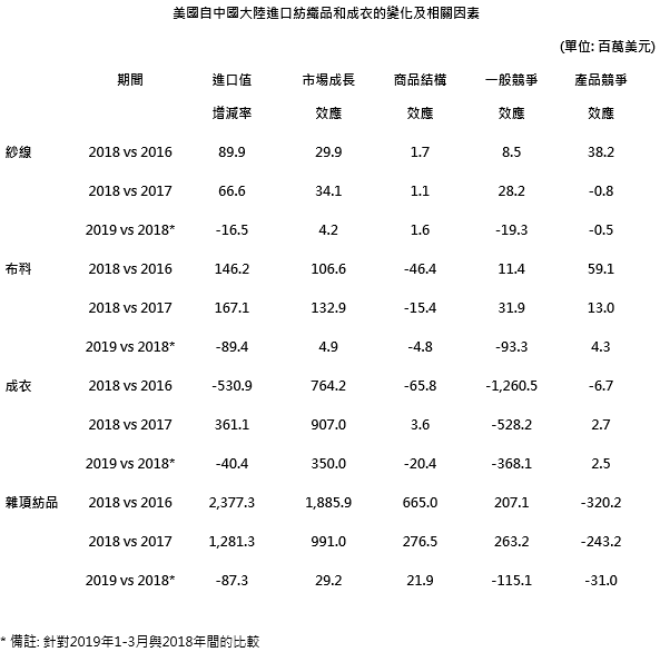 CMS模式結(jié)果顯示,即使在關(guān)稅戰(zhàn)前,中國成衣出口競爭力也在減弱當(dāng)中,這是導(dǎo)致2016-2018年期間中國輸美成衣減少5.3億美元最重要的因素。同樣地,該種競爭力衰退導(dǎo)致,2019年第1季中國輸美成衣,與2018年同期相比,減少3.68億美元。