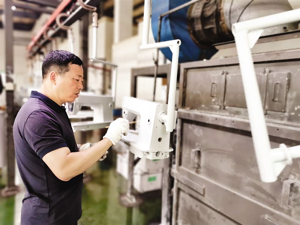 質(zhì)量是企業(yè)的生存之本,是企業(yè)的生命線。一直以來,標(biāo)準(zhǔn)縫紉機菀坪機械有限公司將質(zhì)量與責(zé)任緊密結(jié)合,從每個崗位、每個環(huán)節(jié)、每道工序發(fā)力,以高質(zhì)量在市場中站穩(wěn)腳跟。圖為在企業(yè)烘漆車間,員工在做質(zhì)檢。