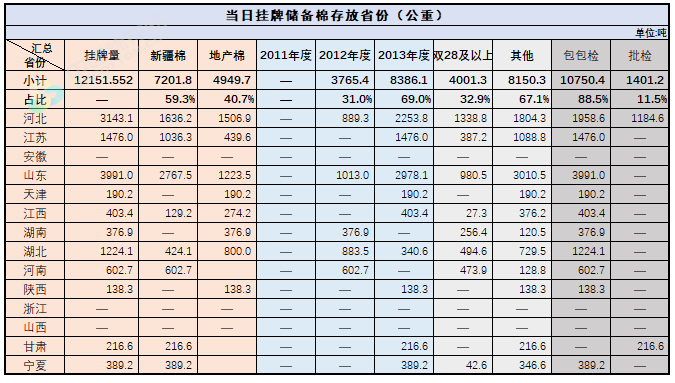 2.當日輪出上市儲備棉中有部分為分批抽樣公檢。抽樣比率及抽樣方法按照棉花國家標準規(guī)定,品質(zhì)指標包括顏色級、軋工質(zhì)量、長度、馬克隆值、斷裂比強度、長度整齊度指標;重量采用原入庫公檢結(jié)果,不再重新檢驗。