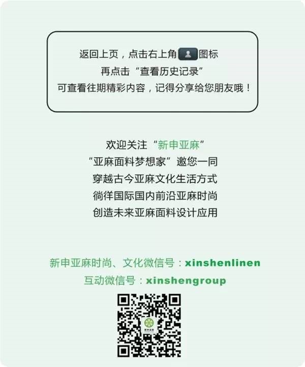 在新申亞麻村,還設有亞麻文化美術(shù)館,一個專門收集、整理、保存、傳播面料的地方。亞麻文化的發(fā)展歷程是怎樣的?1988年的亞麻布料長什么樣?當下亞麻衣物流行什么款式?在這里都可以找到答案。徜徉在亞麻布料檔案館的面料海洋中,觀賞歷年寶貴的亞麻面料,接觸最新的亞麻時尚趨勢,感受傳統(tǒng)亞麻與時尚文化交融碰撞產(chǎn)生的火花,自有一種別樣的樂趣油然而生。