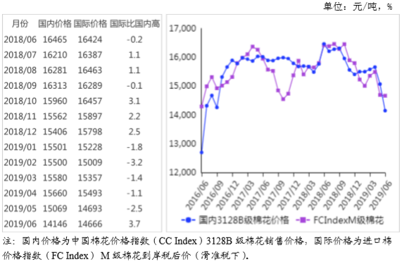 (一)國(guó)內(nèi)棉花現(xiàn)貨價(jià)格大幅下跌。6月上中旬,中美經(jīng)貿(mào)摩擦無(wú)緩解跡象,市場(chǎng)擔(dān)憂情緒加劇,下游紗線需求乏力,加工企業(yè)采購(gòu)積極性不高,國(guó)內(nèi)棉花價(jià)格明顯下行。6月,國(guó)內(nèi)3128B級(jí)棉花月均價(jià)每噸14146元,環(huán)比跌6.1%,同比跌14.1%。鄭棉期貨主力合約(CF909)月結(jié)算價(jià)每噸13765元,環(huán)比漲1.9%,同比跌17.8%。