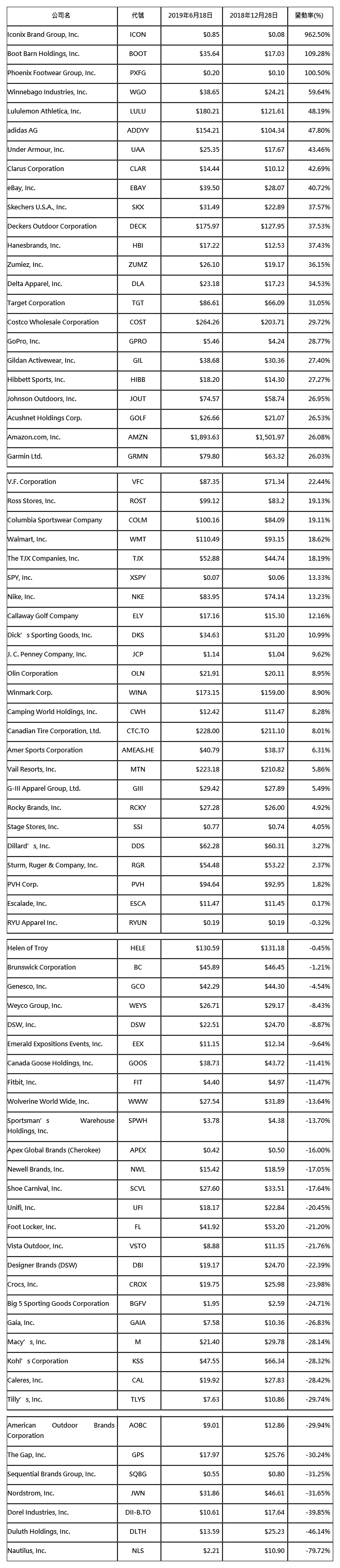 Lululemon于2019年6月公布第1季集團(tuán)盈利再次超越美國(guó)華爾街目標(biāo),展現(xiàn)14.4%成長(zhǎng),該公司股價(jià)除在2018年上漲54.7%外,在2019年上半年也超前48.2%。UnderArmour的品牌業(yè)務(wù)表現(xiàn)持穩(wěn),2018年回復(fù)22.5%后,在2019年上半年上漲43.5%。由于擔(dān)心成長(zhǎng)放緩,adidas在2018年僅上漲6%,2019年上半年股價(jià)翻轉(zhuǎn)上漲47.8%。ClarustCorp.上漲42.7%,DeckersBrands上漲37.5%,其他行業(yè)股票在2018年都呈上漲趨勢(shì)。