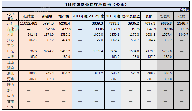 2.當日輪出上市儲備棉中有部分為分批抽樣公檢。抽樣比率及抽樣方法按照棉花國家標準規(guī)定,品質(zhì)指標包括顏色級、軋工質(zhì)量、長度、馬克隆值、斷裂比強度、長度整齊度指標;重量采用原入庫公檢結(jié)果,不再重新檢驗。