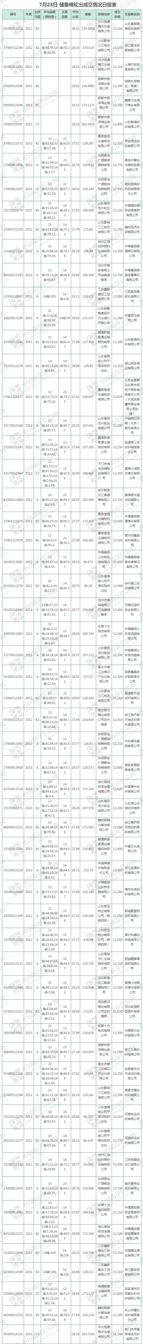 7月23日儲備棉輪出銷售資源11032.463噸,實際成交10528.138噸,成交率95.43%,成交均價12449元/噸,較22日下跌171元/噸;折3128價格13667元/噸,較22日下跌78元/噸。