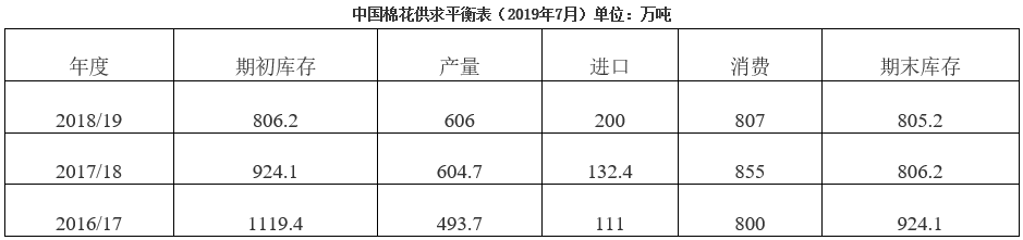 6月中美貿(mào)易摩擦趨于緩和,國內(nèi)外棉花價格跌勢趨緩。月底,國內(nèi)棉花期現(xiàn)貨價格有反彈趨勢;國際棉花市場價格小幅走低,內(nèi)外棉價差與上月基本持平;儲備棉輪出成交量價均下降;紡織市場依然維持弱勢,產(chǎn)量環(huán)比下降,紗線價格繼續(xù)下跌,下旬市場略有好轉(zhuǎn),但訂單仍不足,企業(yè)原料采購較為謹(jǐn)慎,商業(yè)庫存降幅不大。國內(nèi)大部分棉花處現(xiàn)蕾期,據(jù)中國棉花協(xié)會調(diào)查,全國植棉面積4815.6萬畝,同比減少1.77%;總產(chǎn)606萬噸,同比減少0.76%。