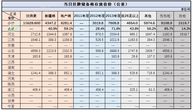 2.當日輪出上市儲備棉中有部分為分批抽樣公檢。抽樣比率及抽樣方法按照棉花國家標準規(guī)定,品質(zhì)指標包括顏色級、軋工質(zhì)量、長度、馬克隆值、斷裂比強度、長度整齊度指標;重量采用原入庫公檢結(jié)果,不再重新檢驗。
