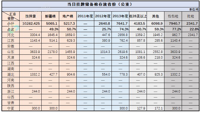 2.當日輪出上市儲備棉中有部分為分批抽樣公檢。抽樣比率及抽樣方法按照棉花國家標準規(guī)定,品質指標包括顏色級、軋工質量、長度、馬克隆值、斷裂比強度、長度整齊度指標;重量采用原入庫公檢結果,不再重新檢驗。