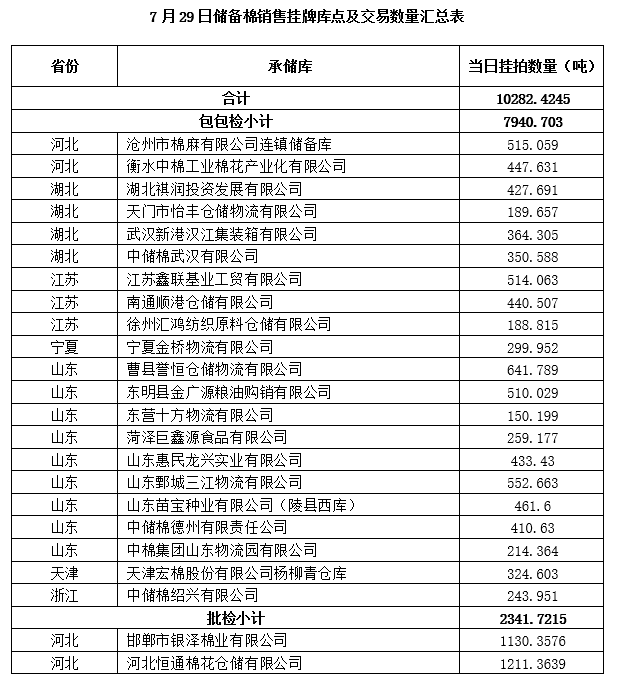 中國儲備棉管理有限公司定于7月29日上市銷售儲備棉重量10282.4245噸,共48捆。