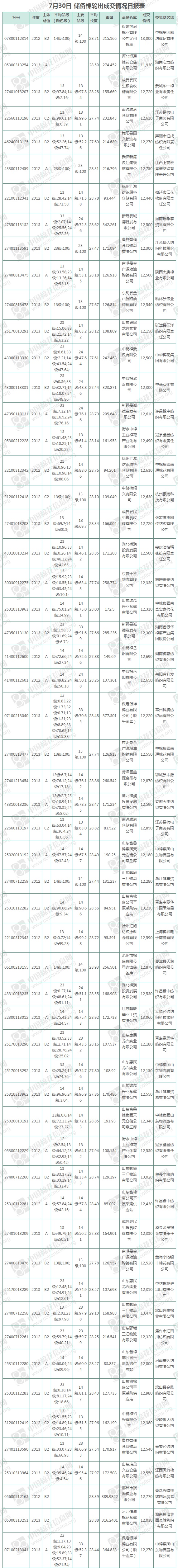 7月30日儲(chǔ)備棉輪出銷售資源11655.7542噸,實(shí)際成交10440.5533噸,成交率89.57%,成交均價(jià)12510元/噸,較29日下跌45元/噸;折3128價(jià)格13863元/噸,較29日上漲61元/噸。