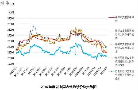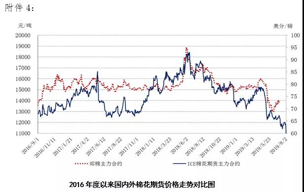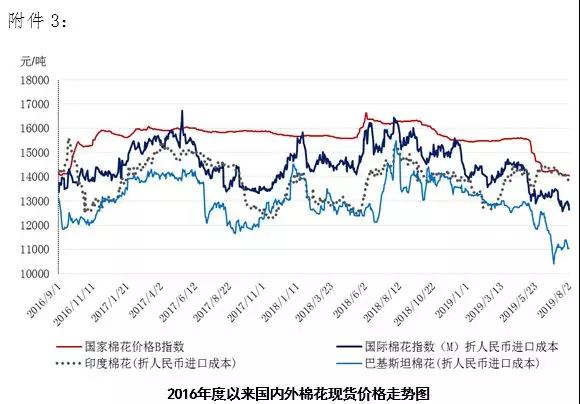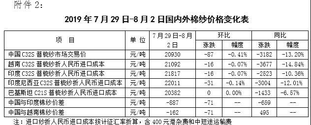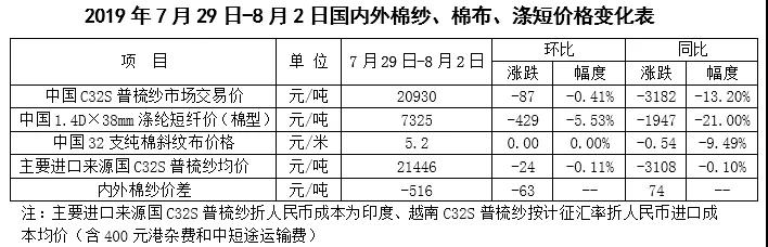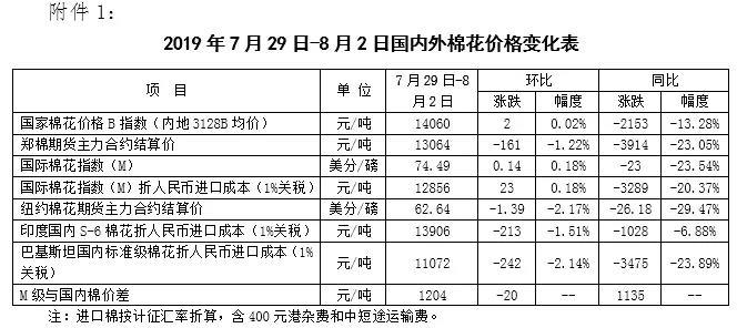 本周,受國際股市下跌及特朗普威脅對中國加征關稅影響,國際棉價下跌。2019年7月29日-8月2日,紐約棉花期貨主力合約結算價62.64美分/磅,較上周下跌1.39美分/磅,跌幅2.17%,代表進口棉中國主港到岸均價的國際棉花指數(shù)(M)73.21美分/磅,較上周下跌1.15美分/磅,跌幅1.54%,折人民幣進口成本12629元/噸,較上周下跌204元/噸,跌幅1.59%;內外棉價差1410元/噸,較上周擴大186元/噸。
