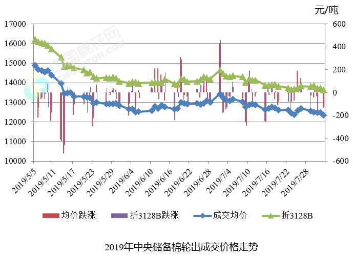 上周(2019年7月29日-8月2日)是2019年中央儲(chǔ)備棉輪出第十三周,中國儲(chǔ)備棉管理有限公司掛牌銷售儲(chǔ)備棉5.35萬噸,其中新疆棉2.42萬噸,地產(chǎn)棉2.93萬噸。