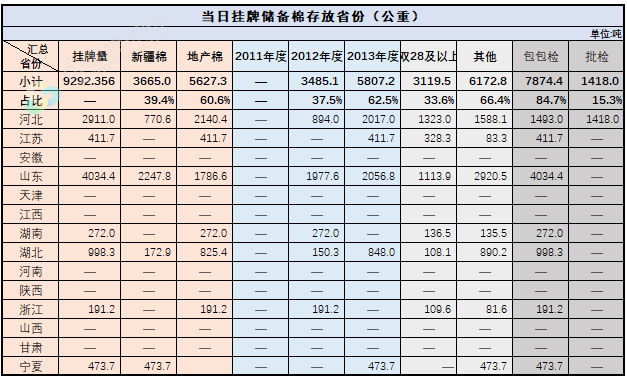 2.當(dāng)日輪出上市儲(chǔ)備棉中有部分為分批抽樣公檢。抽樣比率及抽樣方法按照棉花國(guó)家標(biāo)準(zhǔn)規(guī)定,品質(zhì)指標(biāo)包括顏色級(jí)、軋工質(zhì)量、長(zhǎng)度、馬克隆值、斷裂比強(qiáng)度、長(zhǎng)度整齊度指標(biāo);重量采用原入庫(kù)公檢結(jié)果,不再重新檢驗(yàn)。