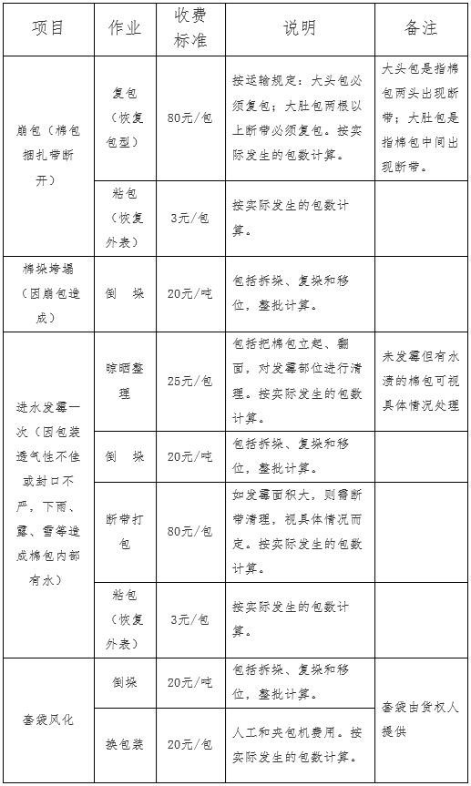 二、交割倉庫要嚴把入庫關(guān),采取措施從源頭上降低棉花期貨倉單貨物炸包、崩包等問題帶來的風險。對已發(fā)現(xiàn)的貨物捆扎帶有質(zhì)量問題的軋花企業(yè),交割倉庫要進行名單登記和風險警示,并督促其整改。如整改不到位,交割倉庫有權(quán)拒絕為該軋花企業(yè)生產(chǎn)的棉花注冊期貨倉單。對已發(fā)現(xiàn)炸包、崩包的棉花,交割倉庫要及時回包,費用標準可參照上表規(guī)定執(zhí)行。