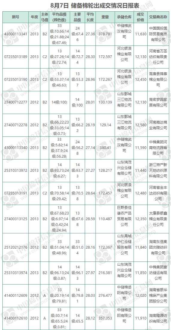 8月7日儲(chǔ)備棉輪出銷售資源10042.4168噸,實(shí)際成交2797.073噸,成交率27.85%,成交均價(jià)11949元/噸,較6日下跌35元/噸;折3128價(jià)格13550元/噸,較6日上漲147元/噸。