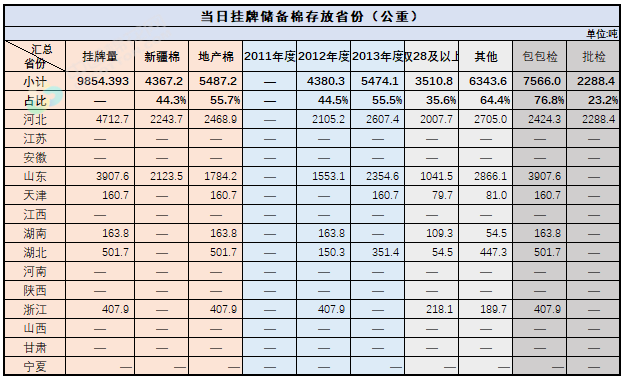 2.當(dāng)日輪出上市儲(chǔ)備棉中有部分為分批抽樣公檢。抽樣比率及抽樣方法按照棉花國(guó)家標(biāo)準(zhǔn)規(guī)定,品質(zhì)指標(biāo)包括顏色級(jí)、軋工質(zhì)量、長(zhǎng)度、馬克隆值、斷裂比強(qiáng)度、長(zhǎng)度整齊度指標(biāo);重量采用原入庫(kù)公檢結(jié)果,不再重新檢驗(yàn)。