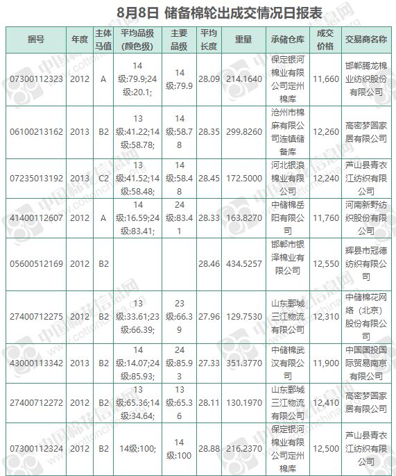 8月8日儲備棉輪出銷售資源9854.3928噸,實際成交2112.4067噸,成交率21.44%,成交均價12195元/噸,較7日上漲246元/噸;折3128價格13603元/噸,較7日上漲53元/噸。