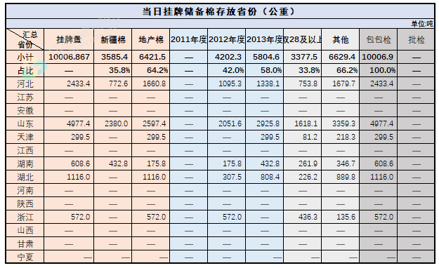 2.當(dāng)日輪出上市儲(chǔ)備棉中有部分為分批抽樣公檢。抽樣比率及抽樣方法按照棉花國(guó)家標(biāo)準(zhǔn)規(guī)定,品質(zhì)指標(biāo)包括顏色級(jí)、軋工質(zhì)量、長(zhǎng)度、馬克隆值、斷裂比強(qiáng)度、長(zhǎng)度整齊度指標(biāo);重量采用原入庫(kù)公檢結(jié)果,不再重新檢驗(yàn)。