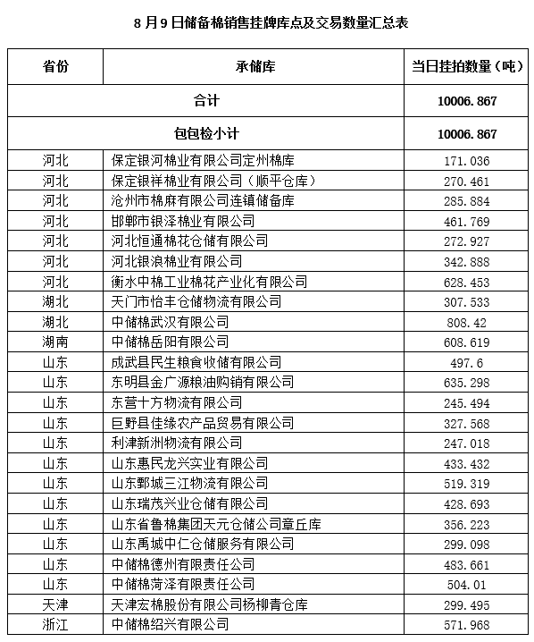 中國(guó)儲(chǔ)備棉管理有限公司定于8月9日上市銷售儲(chǔ)備棉重量10006.867噸,共57捆。
