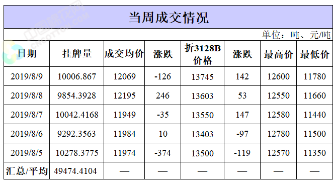 截至8月9日累計(jì)輪出銷售資源74.59萬噸,成交最高價15930元/噸,成交最低價11350元/噸。