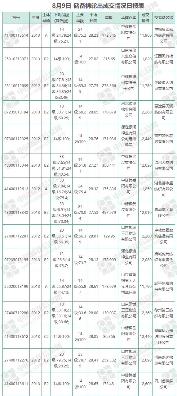 8月9日儲備棉輪出銷售資源10006.867噸,實(shí)際成交3120.377噸,成交率31.18%,成交均價12069元/噸,較8日下跌126元/噸;折3128價格13745元/噸,較8日上漲142元/噸。