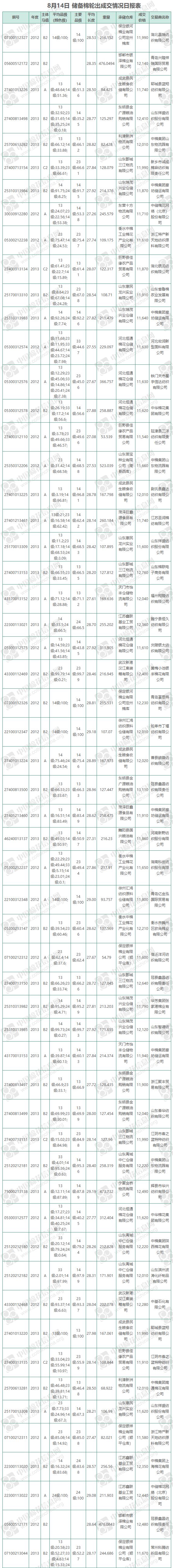 8月14日儲(chǔ)備棉輪出銷售資源11738.1087噸,實(shí)際成交11233.9737噸,成交率95.71%,成交均價(jià)11999元/噸,較13日上漲109元/噸;折3128價(jià)格13222元/噸,較13日上漲159元/噸。