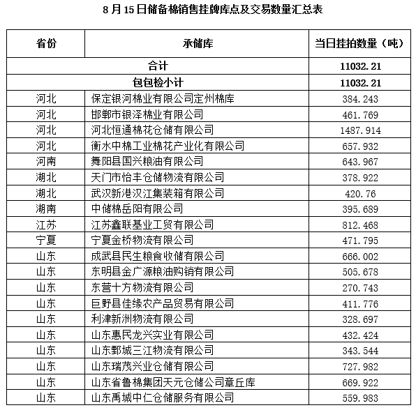 中國儲備棉管理有限公司定于8月15日上市銷售儲備棉重量11032.21噸,共59捆。