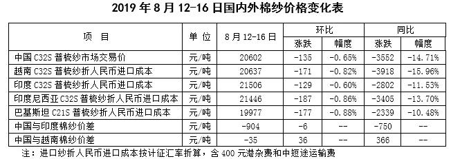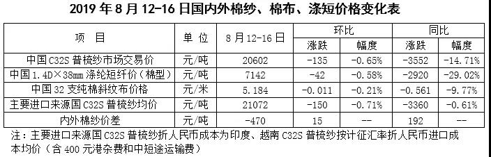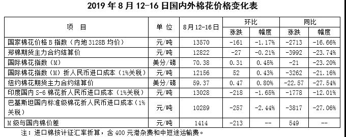 本周,針對美國宣布將對約3000億美元自華進口商品加征10%關稅,中方表示將不得不采取必要的反制措施,市場悲觀情緒再度加劇,國內棉價繼續(xù)下跌。2019年8月12-16日,代表內地標準級皮棉銷售價格的國家棉花價格B指數(shù)13570元/噸,較上周下跌161元/噸,跌幅1.17%;鄭州棉花期貨主力合約結算均價12822元/噸,較上周下跌27元/噸,跌幅0.21%;儲備棉輪出成交均價11960元/噸,較上周下跌60元/噸,跌幅0.50%