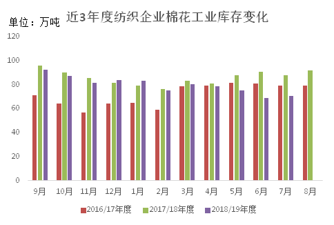本月下旬鄭棉期貨繼續(xù)下跌,部分紡織企業(yè)原料庫存較低,開始補庫,原料庫存略有增加。截至7月31日紡織企業(yè)在庫棉花庫存量70.55萬噸,較上月底增加1.75萬噸,同比減少8.99萬噸。其中24%企業(yè)減少棉花庫存,34%增加庫存,42%基本保持不變。