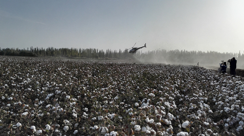 在新疆的示范棉田,直升機正在精準(zhǔn)噴藥灑水。
